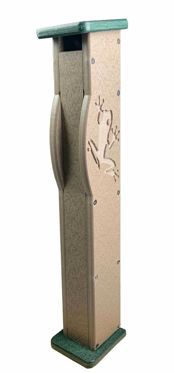 Shelter for tree frogs is made of recycled plastic (poly-lumber), it will never fade or crack. Features a removable roof for easy cleaning after summer season, complete with easy instructions.