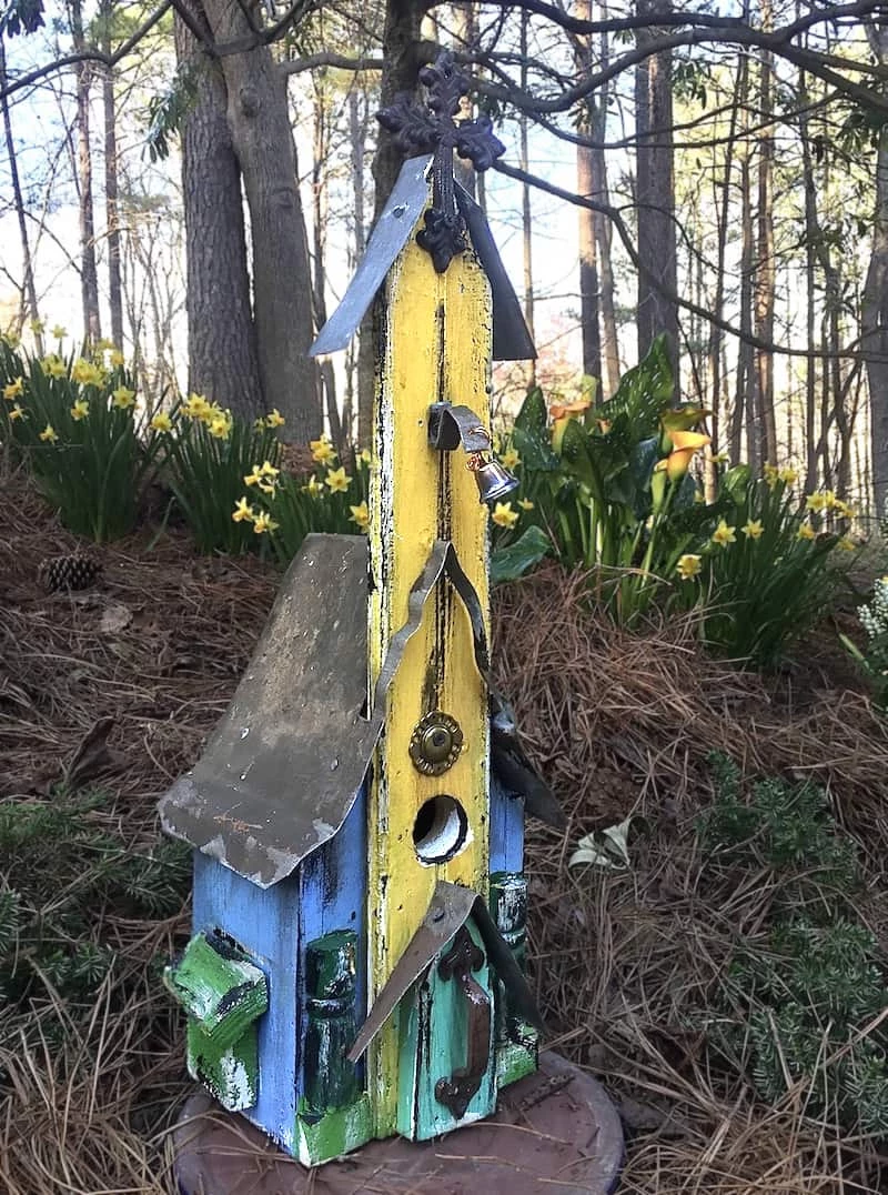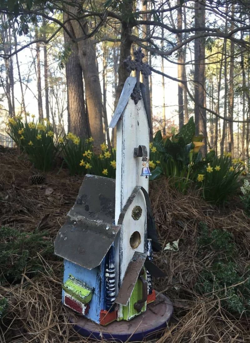 Handmade in Georgia from reclaimed materials, these birdhouses boast 50+ year old wood painted with unique style. Church bird house is functional art for the landscape, providing your birds a cozy nesting site in spring and roosting spot throughout the year.